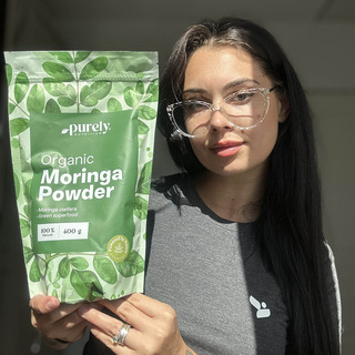 BIO Moringa în pulbere de la Purely Nutrition este obținută din frunzele uscate de moringa conform principiilor producției ecologice. Încântă cu un gust ușor acidulat, miros caracteristic și o culoare verde minunată, fiind apreciată și pentru conținutul ridicat de fibre alimentare și proteine, care contribuie la senzația de sațietate și susțin o dietă variată.